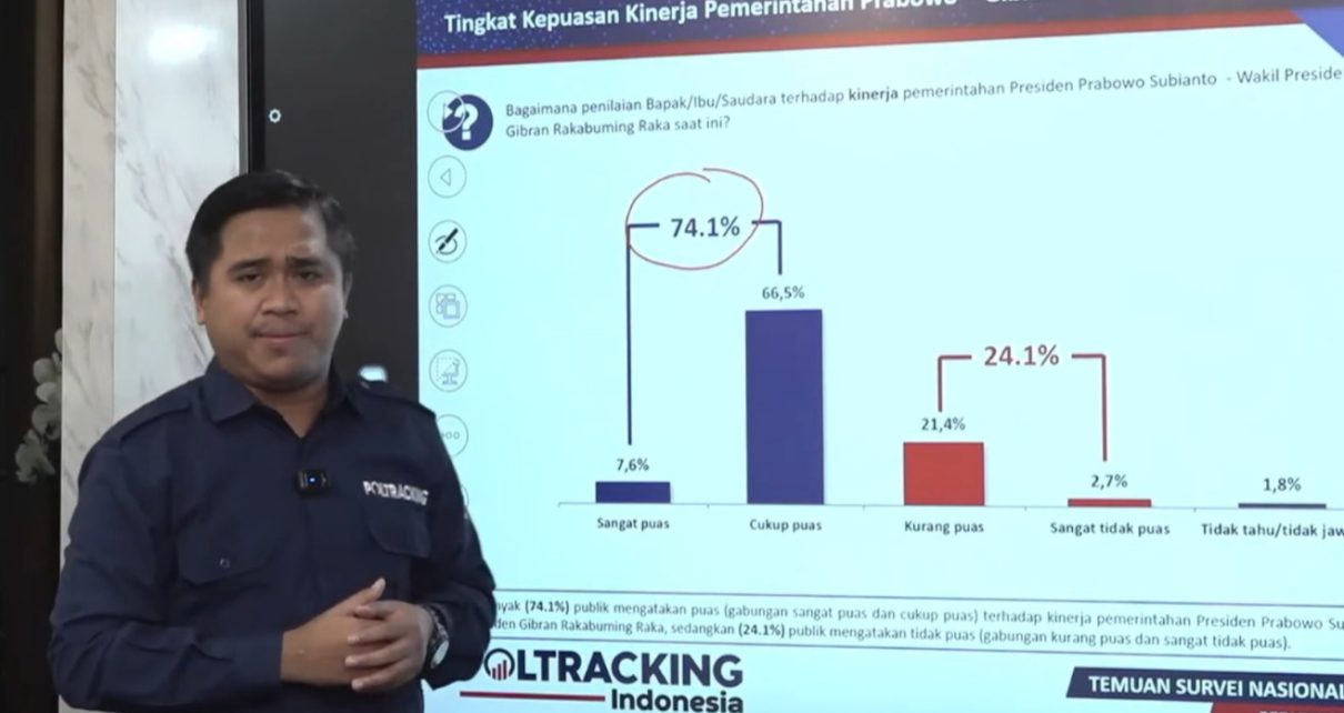 Channel9.id – Jakarta. Lembaga survei Poltracking Indonesia merilis hasil survei bertajuk “Evaluasi Kinerja Pemerintah dan Program Prioritas Prabowo-Gibran.” Berdasarkan survei tersebut, sebanyak 74,1 persen masyarakat menyatakan puas dengan pemerintahan Presiden Prabowo Subianto dan Wakil Presiden Gibran Rakabuming Raka. Angka tersebut merupakan gabungan dari 7,6 persen publik yang merasa sangat puas dan 66,5 persen cukup puas […]