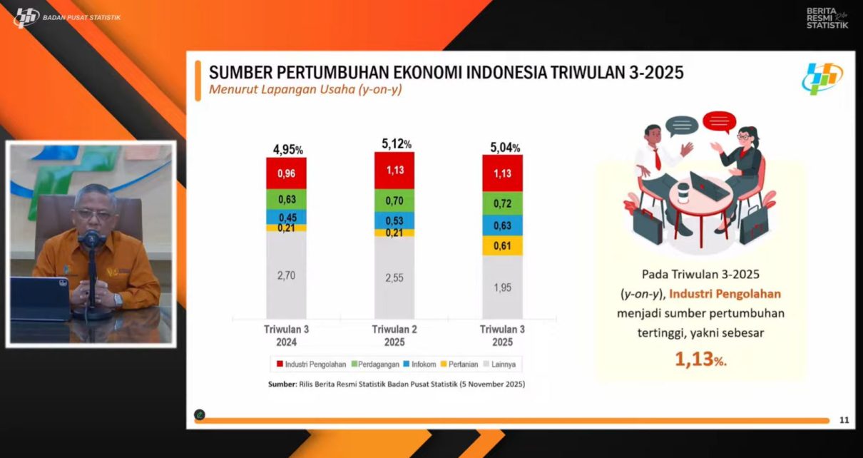 Channel9.id – Jakarta. Badan Pusat Statistik (BPS) mencatat pertumbuhan ekonomi Indonesia pada triwulan III 2025 mencapai 5,04 persen year on year (yoy). Angka ini ditopang oleh konsumsi masyarakat dan investasi.